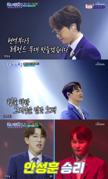 안성훈과 박서진의 '초절정 인기남 빅매치'에서는 조항조의 '돌릴 수 없는 세월'로 흠잡을데 없는 100점짜리 가창력을 뽐내며 저승사자 박선주, 이홍기 그리고 작곡가 주영훈, 알고보니 혼수상태까지 한방에 사로잡은 안성훈이 13:2로 승리했습니다. 박서진은 오승근의 '떠나는 임아'로 트롯의 감칠맛을 제대로 살렷다는 평가를 받았습니다.