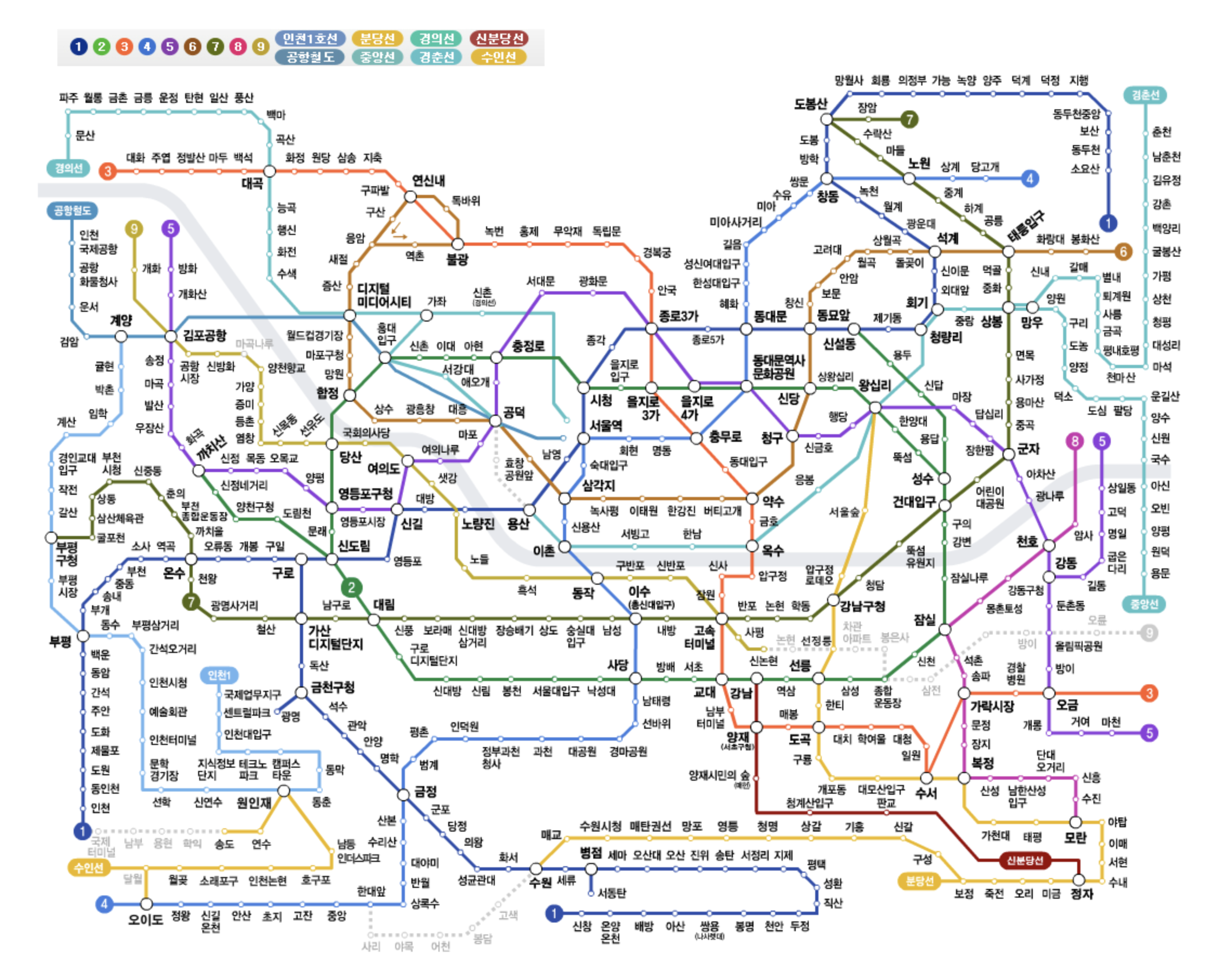 서울의 지하철은 1호선부터 9호선, 그리고 다양한 노선의 경전철로 이루어져 있으며, 대부분의 관광 명소와 주요 지역을 연결합니다.