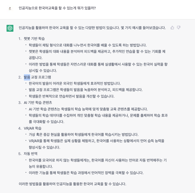 나: 인공지능으로 한국어교육을 할 수 있는게 뭐가 있을까?