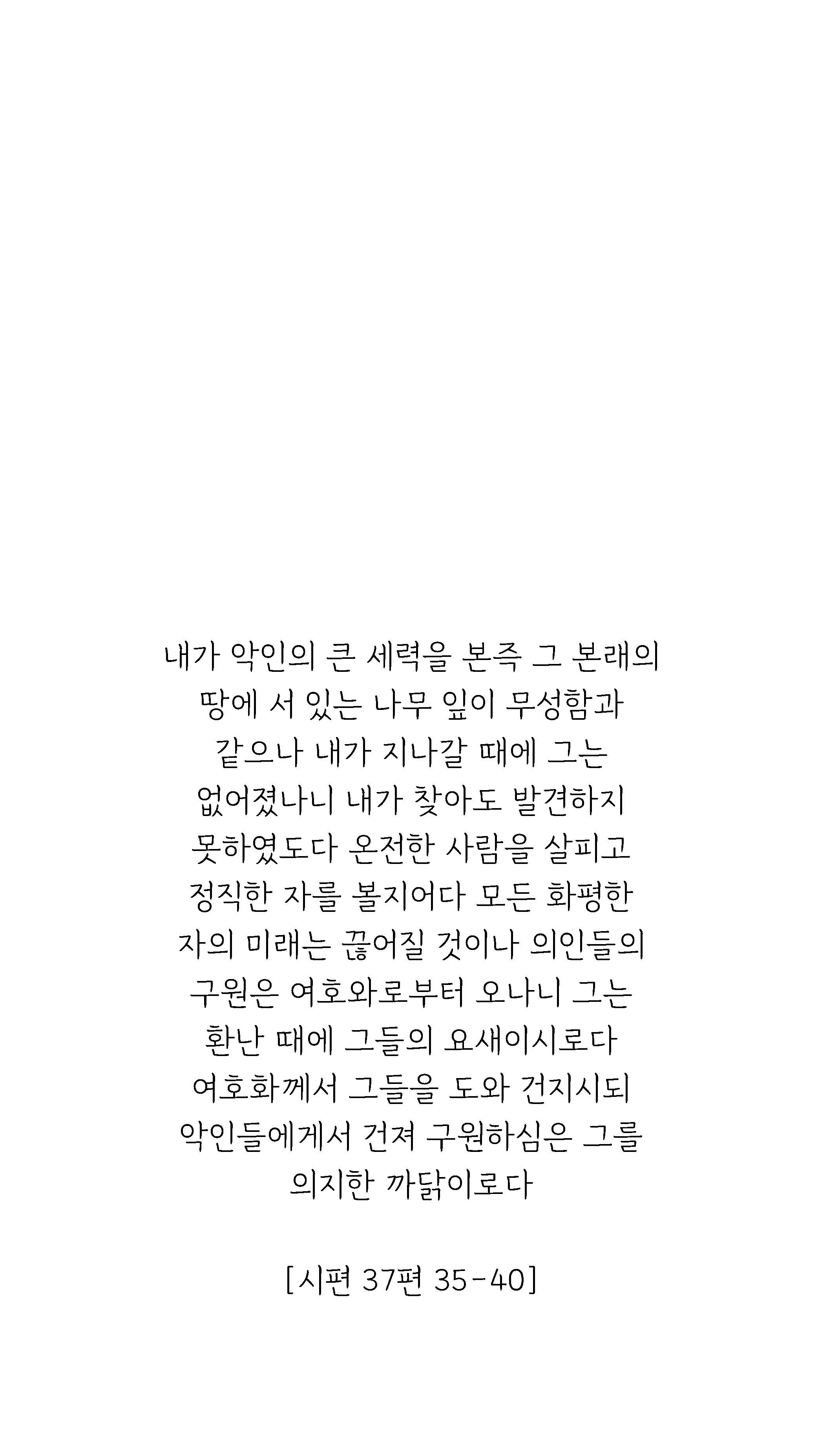 내가 악인의 큰 세력을 본즉 그 본래의 땅에 서 있는 나무 잎이 무성함과 같으나 내가 지나갈 때에 그는 없어졌나니 내가 찾아도 발견하지 못하였도다 온전한 사람을 살피고 정직한 자를 볼지어다 모든 화평한 자의 미래는 끊어질 것이나 의인들의 구원은 여호와로부터 오나니 그는 환난 때에 그들의 요새이시로다 여호화께서 그들을 도와 건지시되 악인들에게서 건져 구원하심은 그를 의지한 까닭이로다